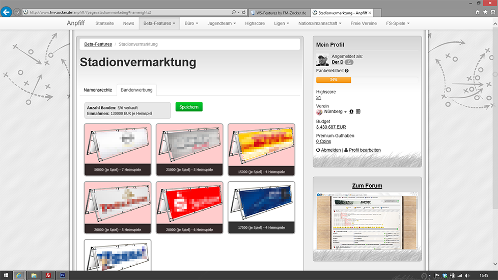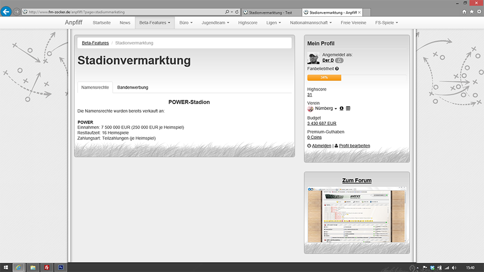- Die Einnahmen der Namensrechte kann als Einmalzahlung oder Ratenzahlung (Einnahmen pro Heimspiel) vom User gewählt werden.