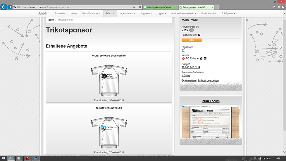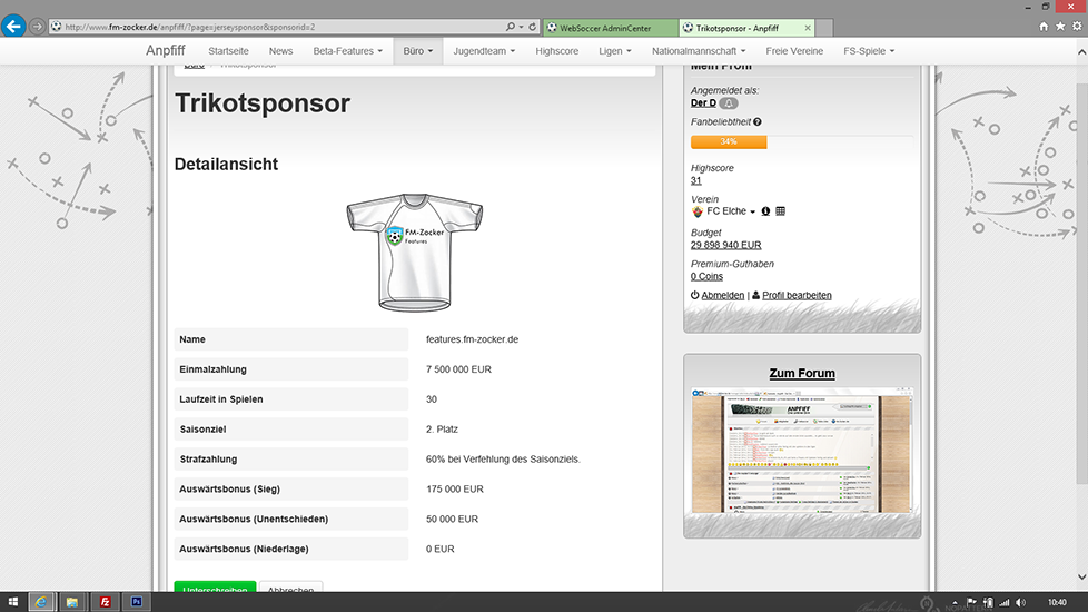 - User können bekommen Angebote für Trikotsponsoren und können zwischen diesen einen Sponsor auswählen.
