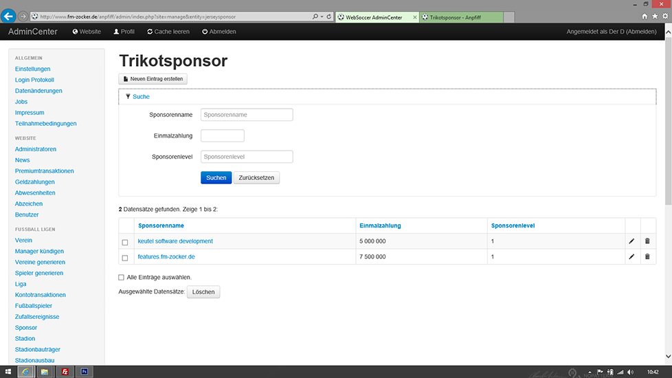 - Sponsoren können angelegt, gelöscht und bearbeitet werden.
