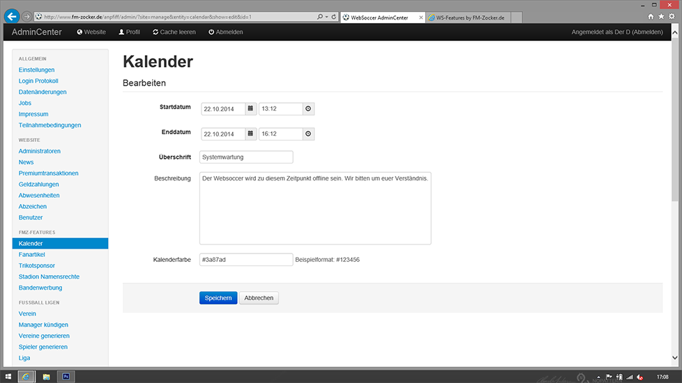 - Die Farbe für die Kalendereinträge kann festgelegt werden (Pflichtspiele, Freundschaftsspiele, Jugendspiele, Usertermine).