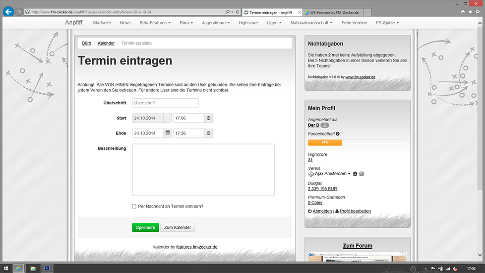 - Jeder User kann sich im Kalender eigene Termine eintragen und wird (auf Wunsch) per Nachricht an diese erinnert.