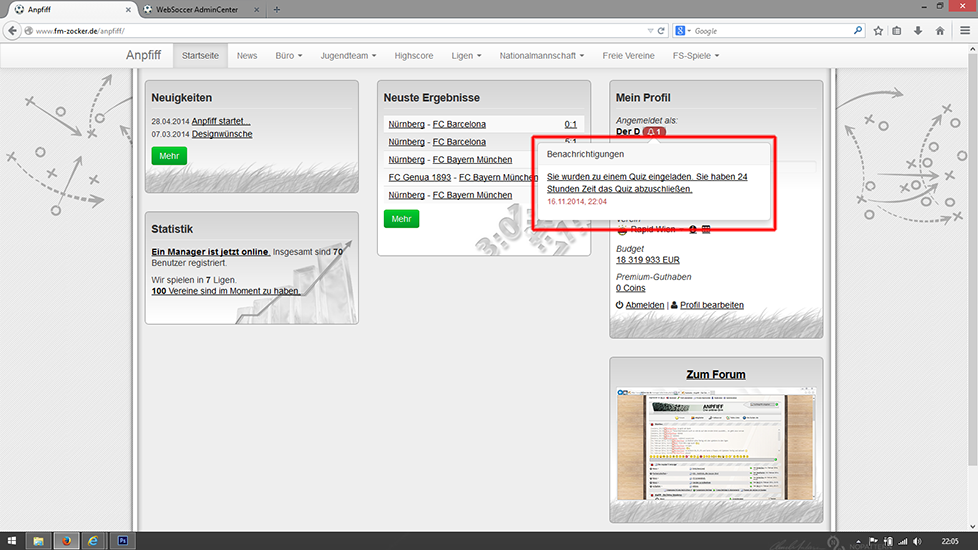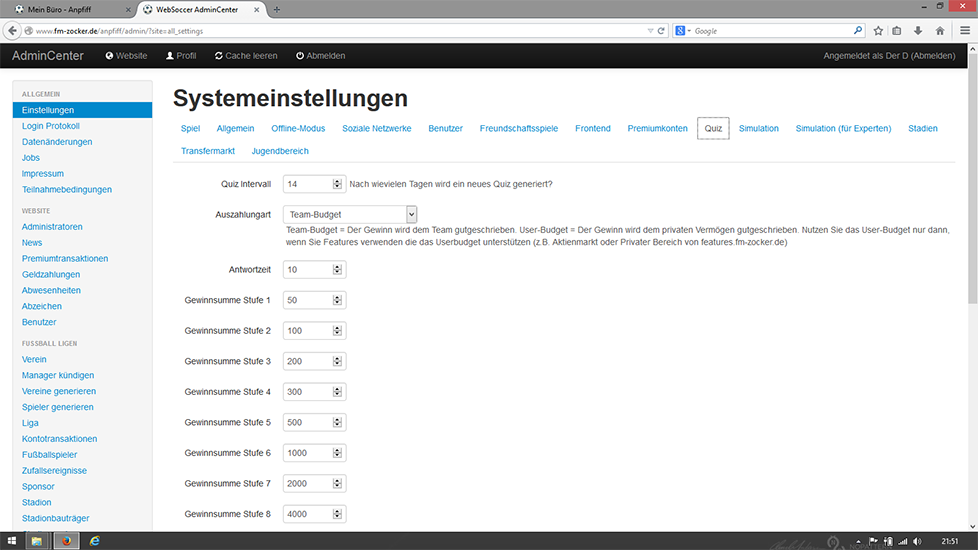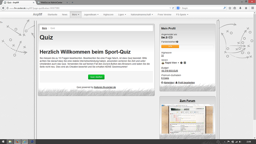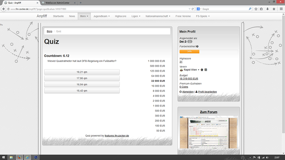 Ein zufällig ausgewählter User erhält die Chance an einem Quiz teilzunehmen. Die Gewinnsumme wird entweder dem Verein oder dem privaten Vermögen des Users gutgeschrieben (Je nach Admin-Einstellung). Der ausgewählte User muss innerhalb 24 Stunden das Quiz starten, ansonsten verfällt die Einladung.