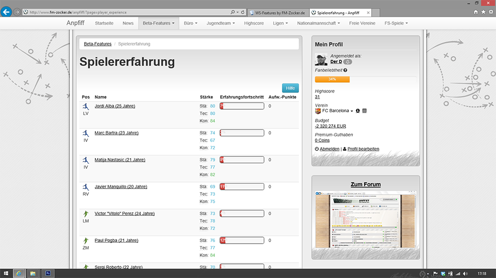 Spieler gewinnen an Erfahrung und können Spielerattribute verbessern.Userbereich: